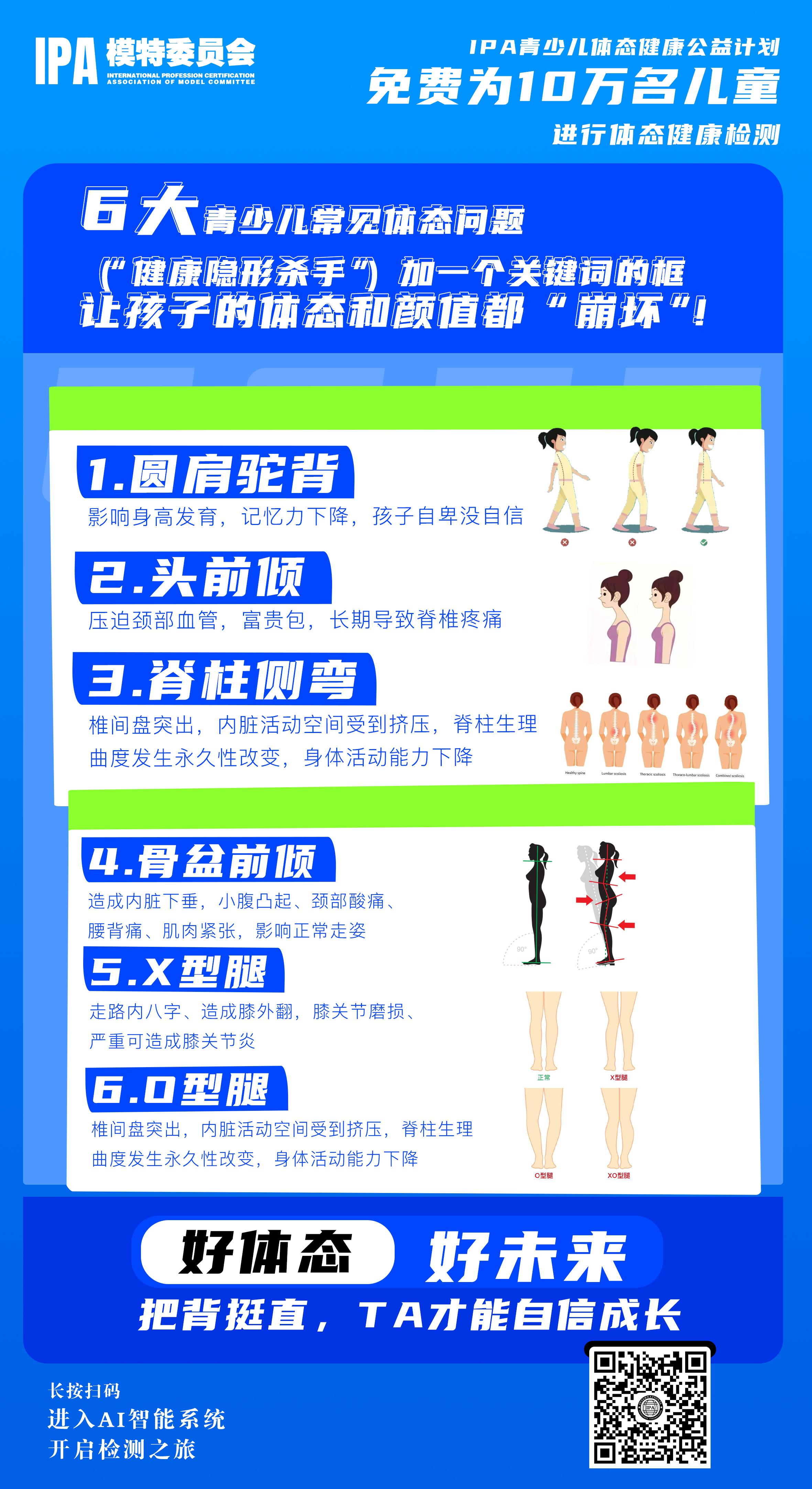 IPA青少儿体态健康公益计划致力于实现免费为10万名儿童进行体态健康检测,IPA模特委员会做到了破除技术门槛,研发上线了IPA体测AI智能系统。大力实现青少儿体态健康普及工程的落地推广。