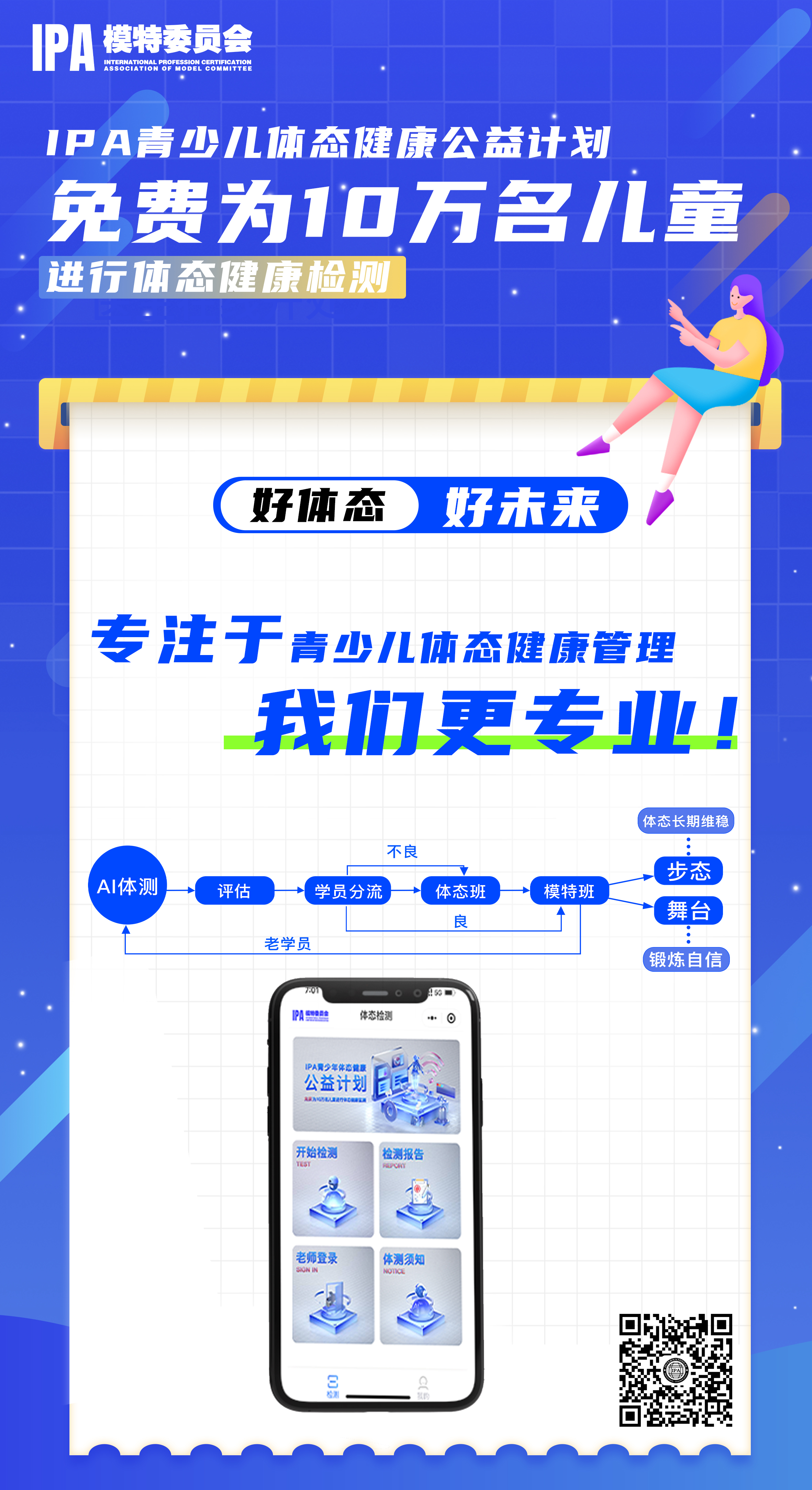 为积极响应政策,推动青少儿体态健康。IPA模特委员会作为少儿形体教培行业引领者,肩负起青少儿体态健康发展的伟大使命!故成立IPA青少儿体态健康普及工程,以“体测AI智能系统”+“体态健康管理师”的双重落地方式,将青少儿体态健康管理普及至全国,让每一个IPA的孩子都能受益!
