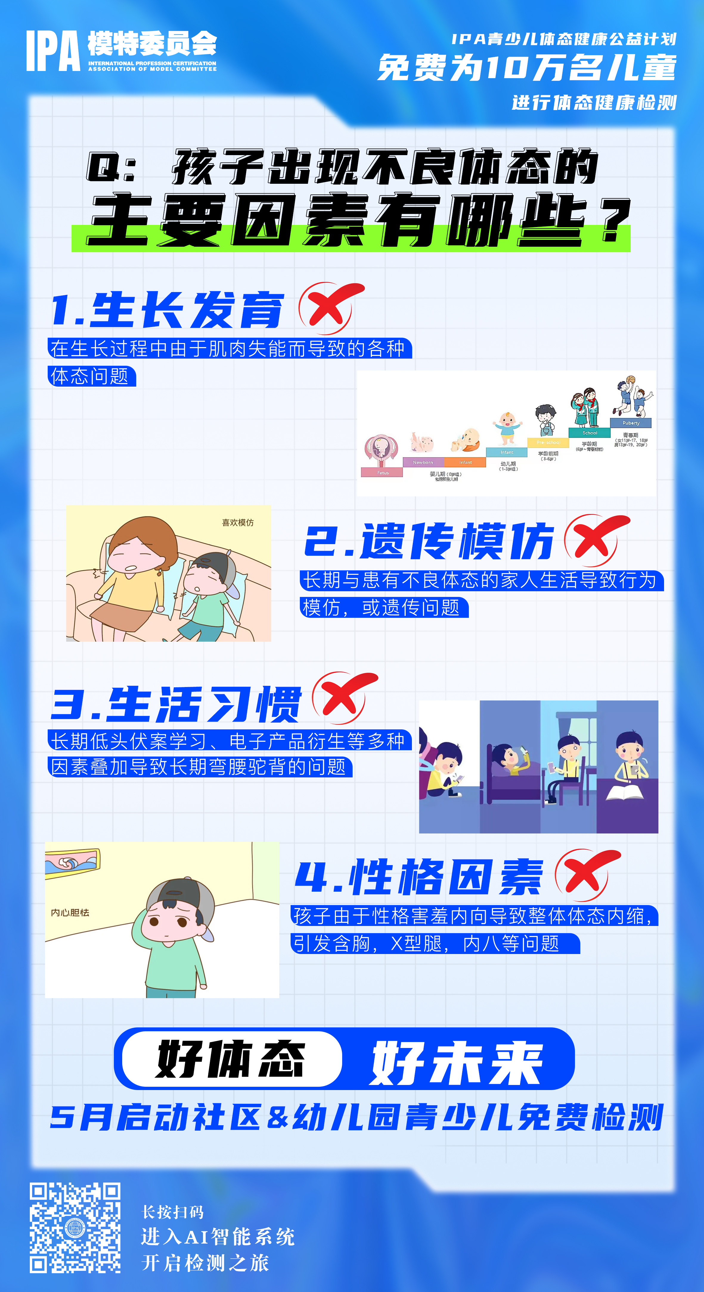 2022年5月1日,IPA模特委员会在正式启动了IPA青少儿体态健康公益计划,全国700余家IPA分会/代理成为首批公益推广人,在IPA模特委员会积极动员下,向全国社区、幼儿园免费开放青少儿体态检测!